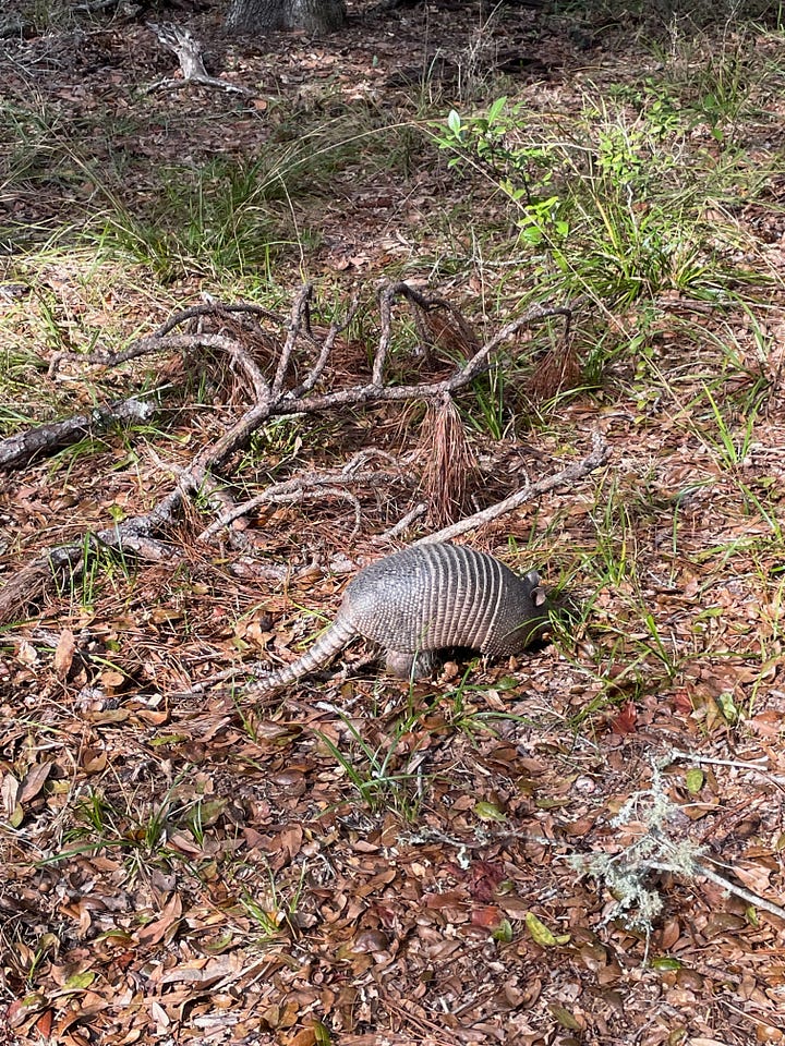 Right beside that gas station is the entrance to the Guana Tolomato Matanzas National Estuarine Research Reserve. I often stop there after class for a hike through the maritime forest. On the trail this time of year, it’s common to find armadillos nosing for grubs at the trail’s edges.